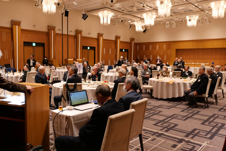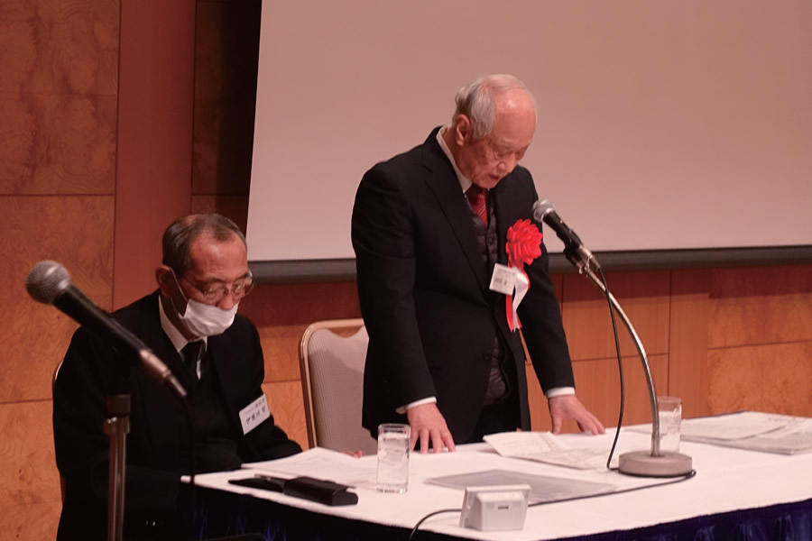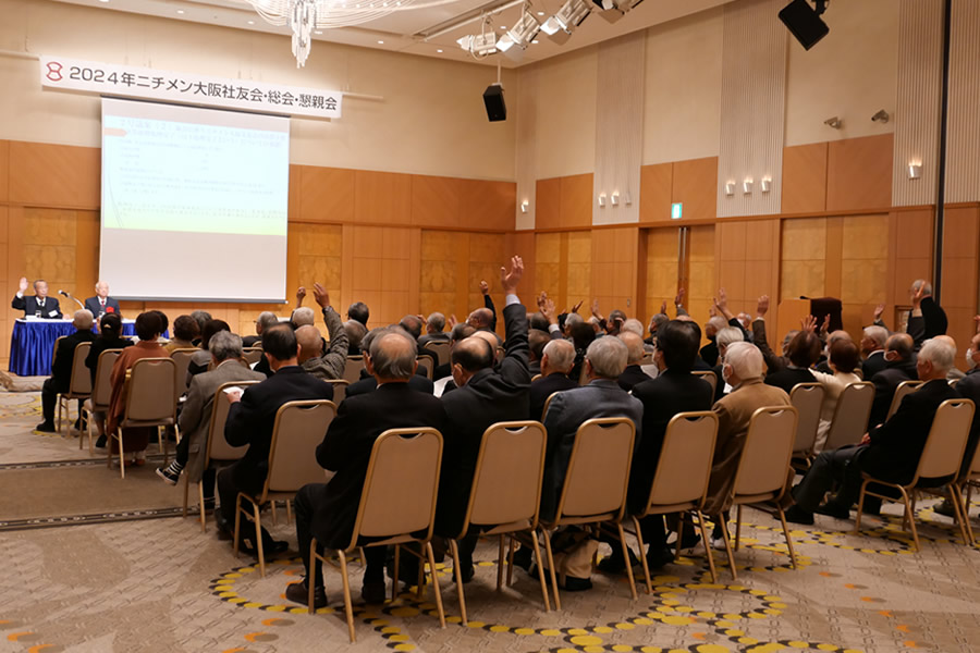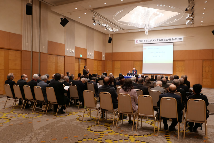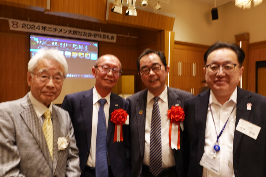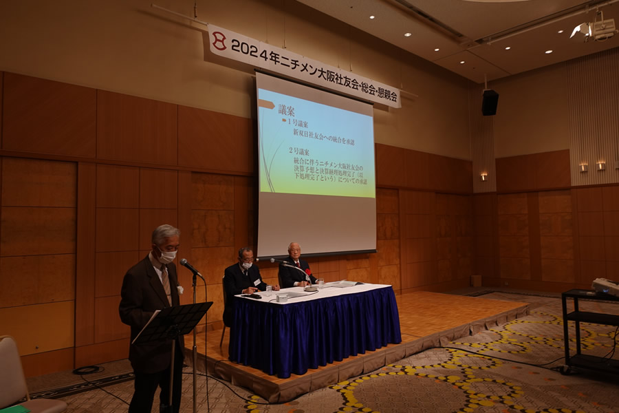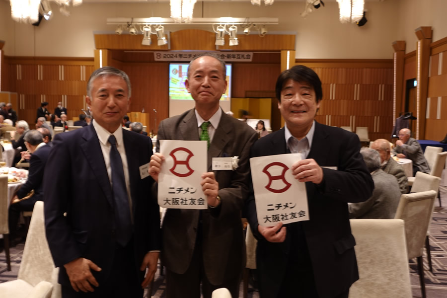 | 本日は、お忙しい中、ご参集いただきまして誠に有難うございます。 先ほど開催いたしました、臨時総会で「4社友会への統合」をご承認いただきまして誠に有難うございます。それでは、これよりニチメン大阪社友会としては最後になります「新年互例会」を開催致します。まずは、新年を寿ぎまして、一言年頭のご挨拶を申し上げます。 | ![]() |