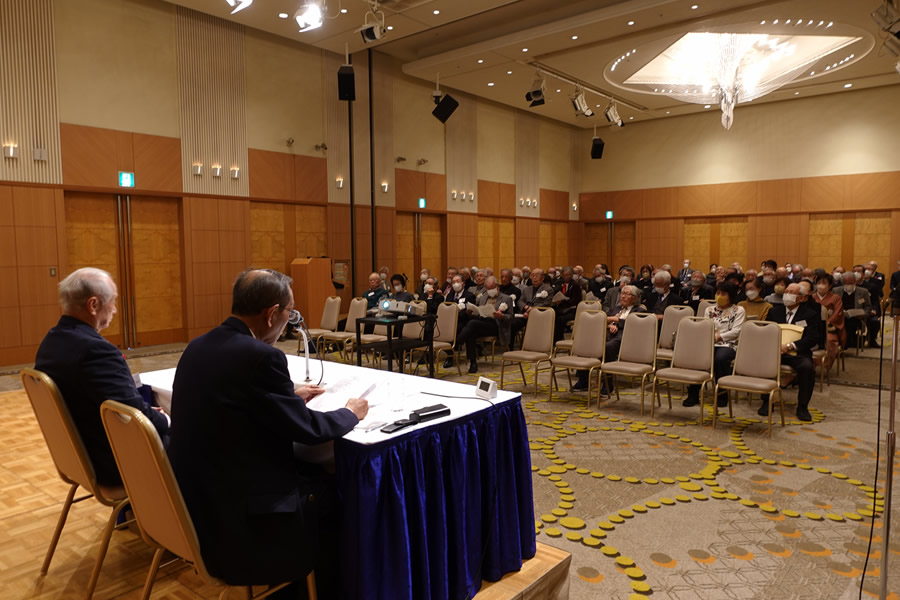 | 1月10日には、当社友会の初代会長を勤められた田淵様がお亡くなりになられました。ここで、亡くなられた皆様方に対し、黙祷をささげたいと思いますので、恐れいりますが、その場で、座ったままで結構ですので、黙祷をお願い致します。(黙祷) 有難うございました。 これより新年互例会に入りますが、それに先立ち、まずは、昨年より持ち越されてまいりました「統合」に関しての臨時総会を開催し、「皆様にご審議して頂きたいと存じます。皆さまの活発なご意見をよろしくお願いいたします。 昨年の7月4日に双日(株)の藤本社長より、「双日に合併してから、すでに今年で、20年の節目になるので、4つの社友会を統合して貰いたい」との要請を頂き、9月より、統合チームを交え、いろいろ検討を重ねた結果、詳細は未だ未定のところもありますが、最終案を本日皆様にお諮りすることとなりました。当社友会は2007年に716名の会員様の自発的な盛り上がりで、スタートしました。延べ人数で行きますと、936名ですが、それから、ご逝去されたり、退会されたりで、現在は367名と約半数となり、新規入会者もあまり見込めず、徐々にじり貧状態になり、1~2年以内に赤字に転落を余儀なくされるところでありました。正直な話、2019年当時もこの傾向が顕著に表れて来ており、当時かなりの危機感を持ち、各社友会が集まり、相談して、双日(株)に支援金の増額をお願いしようと将に動く直前に、コロナ感染症という予期せぬ事態が発生し、活動を一切休止することになりました。 この予期せぬコロナ感染症により、収入は変わらないが、支出がほとんどストップした3年間という貴重な猶予を貰いました。しかしながら、言っても先が見えて来ており、今後は、会員の皆様にもそれなりのご負担をして頂かなければならないと役員一同でいろいろ検討していた矢先、この統合の話でありました。皆様の中にはいろいろなお考えもあろうかと思いますが、今後続いてくる後輩達にも喜んで社友会に参加して頂き、将来に亘って継続して貰いたいとの思いで我々は「統合」に舵を切った次第であります。 まだ統合の細かな話し合いは続いておりますが、大まかなところがほぼ決まった段階となり ましたので、臨時総会にお諮りし、この方向性の承認と決算までの作業については我々役員に一任して頂きたいとの議案を提出させていただきましたので、よろしくご審議のほどお願いい たします。 | |