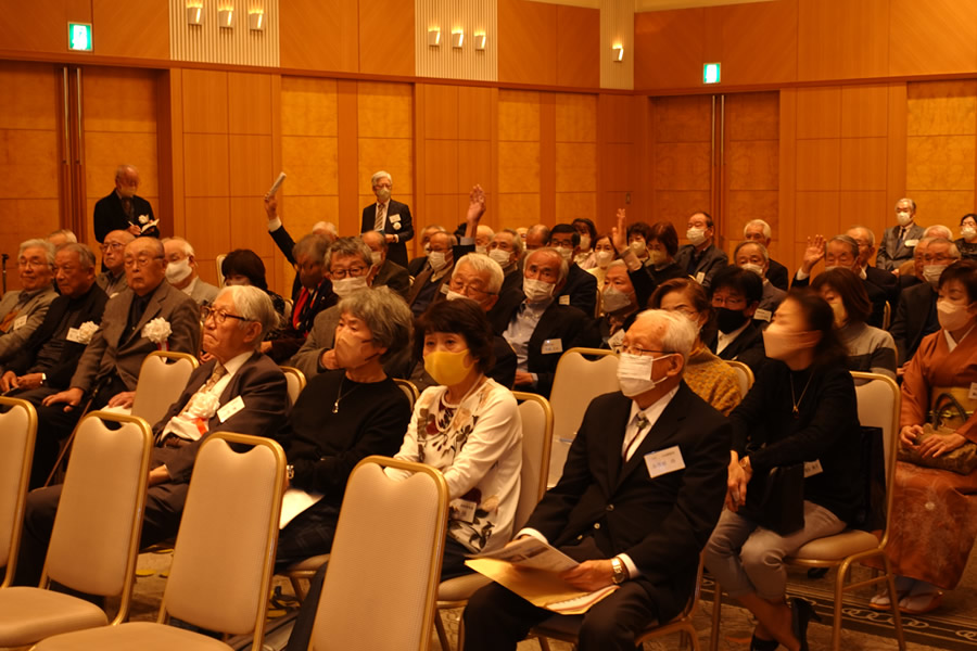 | それでは、恒例によりまして、本年、目出度く、99歳の白寿を迎えられる1名様と88歳の米寿をお迎えになられます29名様に対し、お祝いのセレモニーを開始します。皆様とともにお喜びを申し上げたいと思います。皆様方が、これからもますますお元気でお過ごしいただき、米寿の方々も、次回の白寿をお元気で、迎えられることを願っております。 | |